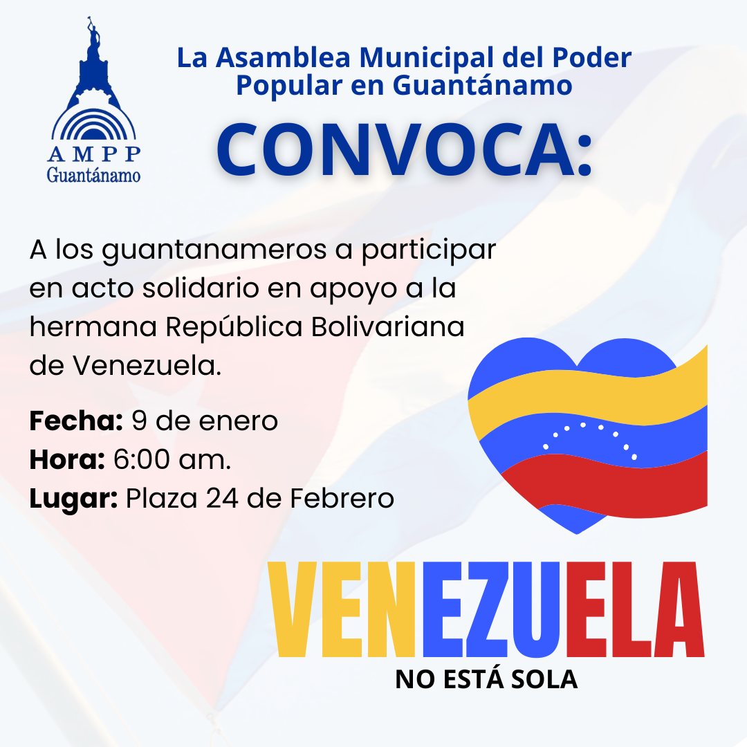 Guantánamo.- La Asamblea municipal del Poder Popular en Guantánamo convoca a trabajadores, estudiantes y pueblo en general a participar este viernes 9 a las 6:00 am, en acto solidario para condenar el ataque del gobierno de Estados Unidos contra la hermana República Bolivariana de Venezuela y la muerte de 32 cubanos en cumplimiento de su deber.