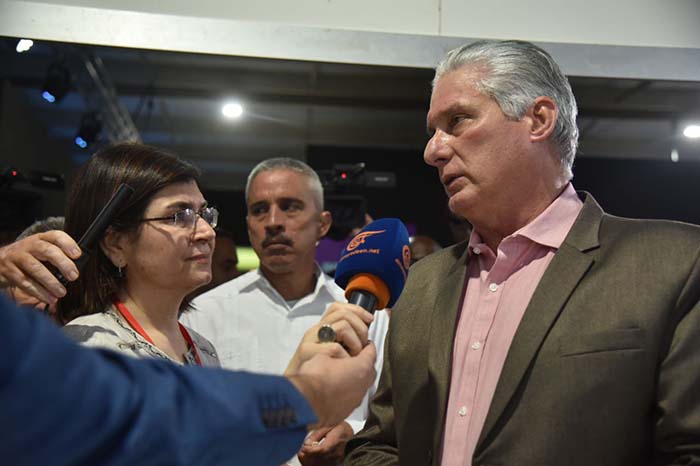 Durante su recorrido por las áreas expositivas del III Coloquio Internacional Patria, en el cual lo acompañó Manuel Marrero Cruz, miembro del Buró Político del Partido y Primer Ministro de la República, junto a otros dirigentes y autoridades, el mandatario cubano ofreció declaraciones a la prensa presente donde condenó los posicionamientos injerencistas de representantes del Gobierno de Estados Unidos.