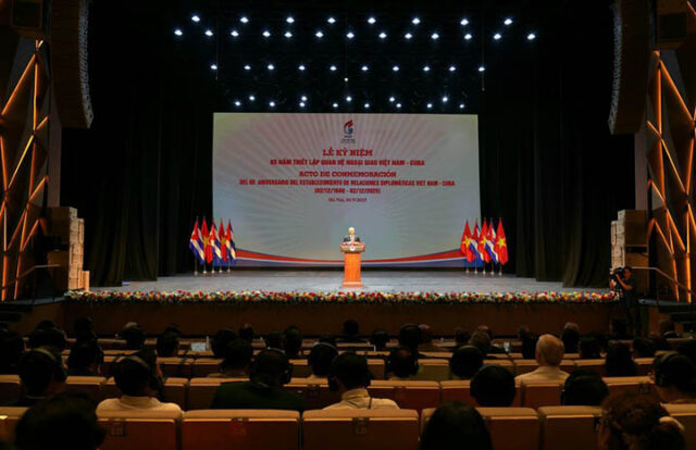 Miguel Díaz-Canel Bermúdez, Primer Secretario del Comité Central del Partido Comunista de Cuba y Presidente de la República, junto a Ho Quoc Dung, Viceprimer Ministro de Vietnam, encabezaron el acto político cultural por el aniversario 65 del establecimiento de relaciones diplomáticas entre ambos países, precisaron fuentes de la Presidencia.