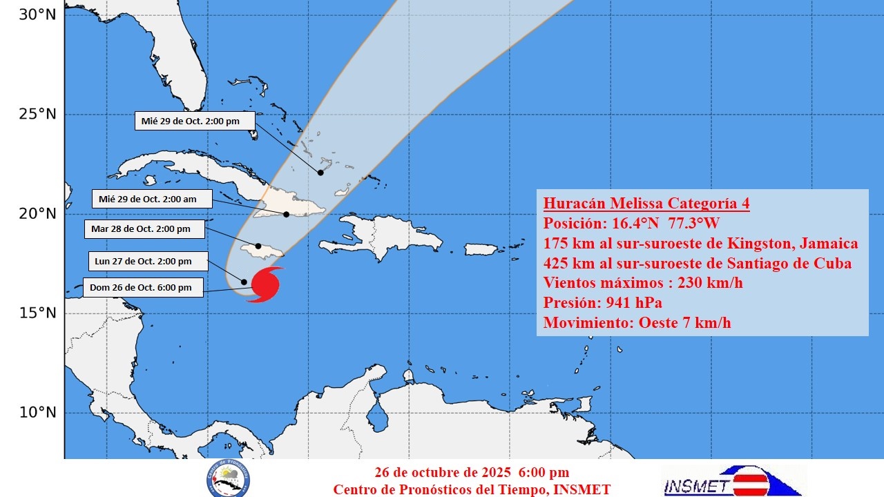 A las seis de la tarde el ojo del huracán Melissa fue estimado en los 16.4 grados de latitud Norte y los 77.3 grados de longitud Oeste, posición que lo sitúa a unos 175 kilómetros al sur-suroeste de Kingston, Jamaica y a 425 kilómetros al sur-suroeste de la ciudad de Santiago de Cuba. Melissa se mueve lentamente con un rumbo próximo al oeste a una velocidad de traslación de siete kilómetros por hora.